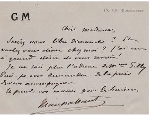 Guy de MAUPASSANT. 1850-1893. Écrivain. L.A.S. 10 Rue Montchanin, s.d. 1 pp. sur bristol petit in-12 oblong, à son chiffre « GM » et adresse.