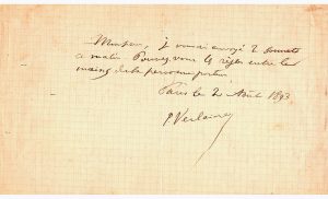 Paul VERLAINE. 1844-1896. Écrivain poète. B.A.S. 2 août 1893. 1 pp. in-8 oblong sur papier quadrillé.