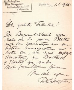 Félix WEINGARTNER. 1863-1942. Chef d’orchestre autrichien. L.A.S. à une dame. Munich, 1er janvier 1905. 1 pp. in-8, en allemand.