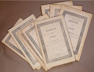 Tenus par le Lieutenant de vaisseau Gay de Taradel, ces journaux relatent la navigation de l’escadre composée des vaisseaux le Colosse, la Guerrière et l’Écho, commandée par l’Amiral Hamelin : départ de Toulon, passage par l’Italie, puis Alger et Gibraltar.