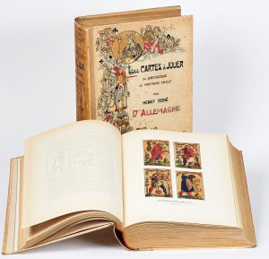 D'ALLEMAGNE (Henry-René). Les Cartes à jouer du XIVe au XXe siècle. Paris, Hachette, 1906 ; 2 forts vol. In-4, cartonnage illustré de l’éditeur, têtes dorées, dos consolidés avec de la toile beige.