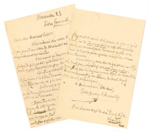 Jules BARBEY D’AUREVILLY. L.A.S., Hôtel Granval Dimanche 23 [décembre 1877], à Victor Lalotte ; 3 pages in-8, enveloppe (timbre découpé, cachet de cire rouge à la devise Trop tard).{CR} Sur les droits de ses Bas-Bleus. « J’étais...