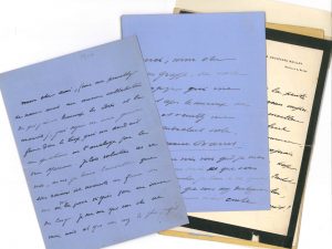 […] Je suis sûr que vous êtes de mon avis et que vous avez le plus parfait mépris, intellectuel s’entend, pour ces dégradés qui boivent à la bouteille des pharmaciens et font les plaisantins dans ses volumes prospectus »… 13 octobre 1900, à Georges Grappe, le remerciant pour son témoignage « qui me parvient après beaucoup de détours »… 1er août 1903 : « Je ne résiste pas à la pente de vous dire que vos sœurs inspiratrices n’auront point de meilleur lecteur que moi. Ce petit livre que vous me paraissez commencer depuis des années je me proposais de l’écrire et j’en amassais trop lentement les matériaux. […] Vous m’aiderez à le rêver de plus près »… Paris 5 novembre 1916, à Georges Hoog : « Vous me dites ces choses charmantes, où je vois les éléments d’un article bien curieux, voulez-vous que je sois ainsi votre collaborateur ? »… On joint 3 envois et une carte de visite de Mme Barrès.