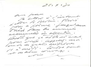 Samuel BECKETT (1906-1989). L.A.S. « Sam », 23 avril 1971, à « cher Jean » ; 1 page oblong in-12.{CR} « Merci pour ce poème. Jusqu’aux ouïes dans les ennuis accumulés in absentia. Désolé que ça aille si mal pour vous....