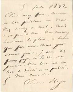 Victor HUGO. L.A.S., 5 juin 1872, [à Léon Cladel] ; 1 page in-4.{CR} « Vous avez fait, Monsieur, un livre puissant et vrai [La Fête votive de Saint-Bartholomée Porte-Glaive]. Vous touchez au mal, mais c’est pour le bien. Vous maniez...