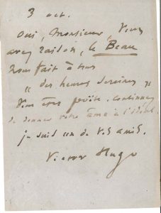 Victor HUGO. L.A.S., 3 octobre ; 1 page in-12.{CR} « Oui, Monsieur, vous avez raison, le Beau nous fait à tous “des heures sereines”. Vous êtes poëte. Continuez de donner votre âme à l’idéal. Je suis un de vos amis, Victor Hugo ».