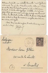 Joris-Kart HUYSMANS. L.A.S., Paris 18 novembre 1897, au poète belge Iwan Gilkin ; 2 pages in-12, enveloppe.{CR} Après la lecture de La Nuit (Fischbacher, 1897) de Gilkin : « Je viens de lire des hymnes infernales de votre nuit ; et ce livre...