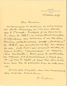 Valery LARBAUD. L.A.S., Valbois 25 octobre 1927 ; 1 page in-4 à son adresse.{CR} « Certainement la dédicace de votre ouvrage me flatte beaucoup, et c’est avec plaisir que je l’accepte. Toutefois je me demande si, dans la NRF, on...