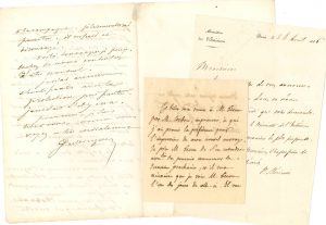 sur Tolède qui peut faire le pendant de La Mort de Venise », 3 à Maurice Levaillant sur la querelle du Jardin de l’Oronte), Ulrich Guttinguer (envoi de ses « derniers vers »), Paul-Gabriel-Othenin comte d’Haussonville (fragment d’article sur le duc de Bourgogne), Félicité de Lamennais (à l’éditeur Lecou, à propos du Livre du peuple), Prosper Mérimée (1846, au sujet d’une commission et d’une requête au ministère de l’Intérieur), Étienne-Denis Pasquier (sur une querelle de généraux), Charles de Rémusat (4, 1824-1826, littérature et politique : concours de la Société de la Morale chrétienne, Le Globe, l’orientation de Charles X ; Guizot, de Broglie, Bastard de Saint-Denis ; Talma ; Auguste de Staël ; Augustin Thierry ; l’engouement pour Clara Gazul ; Prosper de Barante, etc.), Charles Sainte-Beuve (2, à l’éditeur Charpentier à propos de Töpffer, et 1858 à un marquis).{CR} On joint un ex. débroché d’Il Pianto d’Auguste Barbier (1833) ; le discours de réception de Jules Janin à l’Académie avec envoi à Louise Bertin (écrit par sa femme, 1871), etc.