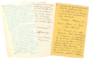 à l’encre verte), Élie Faure (4, 1935-1937, à un camarade, faisant allusion à L’Huma), Georges Ribemont-Dessaignes (belle lettre à Aragon, et poème Un mort sur le bord de la route), André Rolland de Renéville (1956, à un ministre, sur son voyage en Roumanie, fendue), Henri de Régnier (à Albert Fuster).