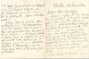 Bilitis annoté, je suis tourmenté par l’idée que tu attribues peut-être mon prochain voyage au désir de revoir M b. A. [Meryem bent Ali] […] c’est une préoccupation si forte que cela a fait pencher immédiatement la balance en dehors de Biskra et j’accueille avec joie tous les conseils qu’on me donne pour n’y pas aller ». Heredia lui répète que le climat de Biskra est déplorable en hiver, et l’encourage à aller aux Canaries : « c’est un paradis et le voyage n’est pas plus cher. Vous ferez à votre retour un livre dont je vous donne le titre : Les Îles Fortunées. […] Je sais d’autre part que Gide avait l’année dernière toujours du feu dans sa chambre »… On lui conseille l’Espagne, mais il ne sait que faire. Landouzy lui a indiqué Le Caire : « Je lui ai répondu que tu ne me le conseillais pas »… Il s’est finalement décidé pour Séville : « “L’atmosphère y est très saine” dit le Joanne qui est généralement sûr au point de vue hygiène. – Et puis comme il faut que je refasse de fond en comble mon roman de St-Enogat qui est une fausse Carmen d’Alexandrie [ce sera Aphrodite], je ne serai pas mal à Triana pour ce travail ». [Louÿs ira en effet à Séville, qui lui inspirera La Femme et le pantin.]