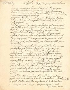 Gabriel Bonnot, abbé de MABLY (1709-1785) philosophe et historien, frère de Condillac. Manuscrit autographe ; 2 pages petit in-4 (on joint une lettre d’envoi de V. de Boissenard à Rémi Boucher de Molandon).{CR} Fragment d’une œuvre de...