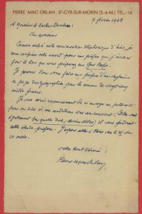 Pierre MAC ORLAN. L.A.S., Saint-Cyr-sur-Morin 7 février 1948, au Dr Bruker ; 1 page in-8 à son en-tête. {CR} Il confirme son accord « pour une préface que j’écrirai pour le livre que vous préparez sur Gus Bofa. Je pourrai donc vous faire...