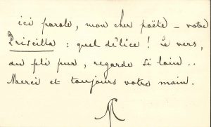Priscilla (Mercure de France, 1895). « Voilà un de ces drames précieux qui suppriment l’oripeau et le carton, se passent dans l’essence même et communiquent jusqu’à une voix au décor ; ce qui, du reste, est l’office de la musique ici parole, mon cher poëte – votre Priscilla : quel délice ! Le vers, au pli pur, regarde si loin… Merci et toujours votre main ».{CR} Correspondance, compléments et suppléments (1998), p. 17.