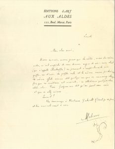 André MALRAUX. L.A.S. avec dessin, Lundi, [à Fernand Fleuret] ; 1 page in-4, en-tête Éditions d’Art Aux Aldes.{CR} Divers ennuis l’ont empêché de donner signe de vie : « mon chat (qui s’appelle Chatouffu) ne pouvant s’empêcher ni...