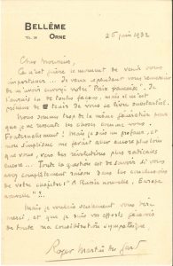 Roger MARTIN DU GARD (1881-1958). L.A.S., Bellême 26 juin 1932, [à Henry de Jouvenel] ; 1 page in-8.{CR} Il le remercie de son livre La Paix française, « livre substantiel. Nous sommes trop de la même génération pour que je ne ressente...
