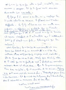 sont le plus près de Dieu. Voilà ce que je voulais vous dire. Oui, il reste tout : c’est-à-dire la sainte Hostie… […] le vieil homme que je suis qui cache, sous tant de pétulance, une tentation de désespoir, à certaines heures, qui l’effraie lui-même, aimerait se coucher lui aussi comme un vieux chien crotté par toutes les boues de tous les chemins, aux pieds du Seigneur que vous avez dans votre maison. Chère Denise, il n’y a pas d’autre bonheur en ce monde que d’avoir un cœur capable de le connaître et de l’aimer »… Jean-Jacques Servan-Schreiber lui a expliqué la terrible situation du Maroc : « Le Glaoui rend tout difficile. Ce Jean-Jacques, si loin de nous, me montre une confiance, une affection, une gratitude qui me touchent. Il fera tout pour Robert [Barrat], je crois, si le ministère dure. Mon fils Jean, que l’E.F.P. avait envoyé en Tunisie, est revenu stupéfait de l’adoration qui l’entourait parce qu’il était mon fils… Étrange vie que la mienne ! Chère Denise, je ne sais si mon amitié est une grâce pour Robert et je me demande si ce n’est pas le contraire. Vous avez peur que je vous juge mal, c’est-à-dire plus en Dieu que vous ne l’êtes. Mais que dirais-je alors de l’idée que vous vous faites de moi ? »… Lettres d’une vie (n° 314).