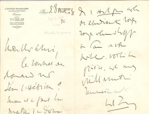 qui convient. La suppression de l’s est une apocope dont le lecteur est prévenu dans la préface. […] C’est une impropriété : je ne sacrifierai jamais aux vanités orthographes dont nous anciens n’étaient pas dupes » ; et il cite Racine… Martigues 11 août 1931. « Je me prépare à rentrer à Paris après un premier séjour ici de 20 jours et je n’y viendrai que du 6 au 15 septembre ! »… Paris 28 mai 1936, au sujet d’un sonnet de Ronsard « sur Léon l’Hébrieu ! Mais il a fait la matière d’un discours dans l’Action Française. […] Voici la pièce » (coupure de presse jointe)…. On joint un texte a.s. de Maurras jeune sur la place de la femme dans la société (2 p. et demie in-12) ; une enveloppe autogr. à Tenant ; et une note a.s. de Jean Tenant au sujet de ces lettres, et une photo.