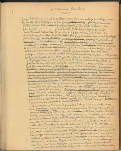 roman publié en 1941 par Plon sous le titre Jacques. Le manuscrit, d’une petite écriture serrée remplissant toute les pages, écrites au recto, présente des additions en regard du texte ou dans les marges étroites, avec de nombreuses ratures et corrections ; il est daté à la fin « 4 mai 1941 » (erreur de pagination entre les pages 9 et 11). Ce récit à la première personne s’ouvre après la défaite de 1940 : « Je me trouvais, au mois de juillet 1940, dans une auberge de village, sur les bords de la Dordogne. Le dix juin, fourrant dans ma petite voiture trois valises et quelques paquets, j’étais parti de Paris. Un peu avant j’avais décidé d’abandonner les grandes routes, terriblement encombrées et m’étais dirigé, au hasard, vers l’Est. En d’autres temps, la vallée de la Dordogne, bien que je la connusse déjà, m’eût enchanté par sa beauté »...
