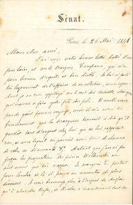 Prosper MÉRIMÉE. L.A.S., Paris 26 mai 1854, à un ami [le baron Georges-Napoléon Baude, attaché d’ambassade à Rome ?] ; 4 pages in-8 à en-tête du Sénat (lég. rouss.).{CR} Sur la vente des collections d’art du marquis Campana,...