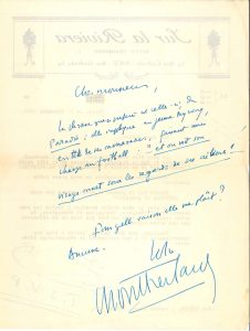 Paradis : « elle s’applique au jeune Peyrony, en tête de ses camarades, faisant une charge au football : …“et on voit son visage muet sous les regards de ses ailiers” – Pour quelle raison elle me plaît ? Aucune »… Alger 3-11-1932, au sujet du journal L’Ordre : « Croyez que le calice d’amertume qu’apporte le journal, chaque matin, à un patriote français, est adouci quand il s’agit de L’Ordre, par tout ce qu’on y trouve d’intelligence et de jugement : on se dit que tout n’est pas perdu »… 1-12-1932. Demande de publier dans L’Ordre des bonnes feuilles : « La grande brièveté du texte que j’ai choisi me semble plaider en sa faveur. Et où exprimer les idées qu’il contient […] sinon chez vous ? »… Le livre paraîtra bientôt. Il accepterait de donner une conférence au Comité Paris-Nancy sur Le Sport et la Guerre, mais pose ses conditions … 27 novembre 1938. Il demande d’annoncer une conférence sur la France de 1938… 9 août 1939. Il demande de publier un article de Mlle Zehrfuss à propos d’une conférence d’Abetz qu’il a présidé, et « qui rétablit quelle fut réellement mon intention en faisant ce laïus à France-Allemagne [...] des échos dont un venimeux (à Je suis partout) ont paru là-dessus ». Il a terminé la série des Jeunes Filles, et il est à présent libre pour proposer des articles… 16-11-1964, sur sa pièce Le Cardinal d’Espagne : « Depuis une quarantaine d’années, mon nom est revenu bien souvent sous votre plume. […] Puisque vous avez écouté ma présentation, vous n’ignorez pas que Le Cardinal n’a pas plu beaucoup au dictateur d’outre-Pyrénées […] Mais le pouvoir est toujours à peu près le même, et j’aurais pu prêter à Cisneros des mots de César ou de Napoléon ; je lui en ai d’ailleurs prêté un qui est de Richelieu : “Je ne dors pas afin que mon peuple puisse dormir à l’ombre de mes veilles” (je me cite de mémoire) »… Etc.