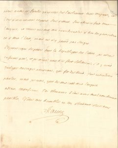 Voltaire.{CR} « Vous avez grand tort, Monsieur, de me reprocher ma paresse à écrire. Sitôt que j’eus reçu les oignons de fleurs, que votre ami me remit dans le mois de Janvier, je vous écrivis le lendemain, et je vous mandois […] que j’avois voulu remettre à cet ami, le prix de ces oignons, et qu’il n’avoit pas voulu le recevoir »… Il félicite Heerkens de travailler tantôt comme médecin, tantôt comme poète : « Apollon étoit aussi le dieu de la medecine. Je lirai avec plaisir vos Questiones medicas. J’ai lu votre dernière Epître, mais je vous avouerai sincerement que j’ai bien de la peine à l’entendre. Si vous n’y prenez garde, vous prendrez le style de Perse ». Il regrette le départ de La Haye de M. La Fontaine, petit-fils du fabuliste, et secrétaire de l’ambassadeur : « Un mouvement de jalousie en a été, dit-on, la cause, en cela bien différent de son illustre grand-père, qui ne connut jamais cette maladie. […] L’ouvrage de Voltaire sur le Roi de Prusse, n’est point encore connu icy. Suivant ce que vous me marquez, il ne manquera pas d’être imprimé. Un Poete est bien hardi d’attaquer des Rois. Je ne sais si le Dieu Mercurialium custos virorum sera assez puissant pour sauver Voltaire de la colere d’un pareil monarque »… Racine évoque ensuite la « triste et fatale querelle du Parlement », alors remplacé par une Chambre royale : « Son absence fait donc languir et cause un tort très considérable à bien des particuliers et à tout l’État, mais on n’y paroit pas songer ». Il mène « une vie fort solitaire » et ignore « ce qui se passe dans la Republique des Lettres »…