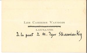 Charles-Ferdinand RAMUZ (1878-1947). P.A., [1920 ?] ; carte de visite (petite mouill.).{CR} Carte de visite Les Cahiers Vaudois, à Lausanne. Ramuz a raturé une ligne sous le titre, et ajouté : « de la part de M. Igor Strawinsky ». [Il...