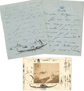dessin à la plume (tête de chien tenant le courrier dans sa gueule).- Lettre illustrée de Venise. Son mari l’informe qu’elle se soigne bien : « je suis très contente de toi ma mignonne. Je travaille tous les jours un peu, généralement le matin avant déjeuner. Je m’installe dans ma gondole dont j’ai fait un atelier ambulant. Je laisse tous mes outils à bord sous la garde du fidèle Antonio qui en sa qualité de Vénitien a le plus profond respect pour les choses de peintres »… En bas de page, dessin à la plume la représentant peignant dans sa gondole ; sur une autre feuille, tête caricaturée : elle a joint une petite reproduction d’un portrait de femme en gondole, contrecollée sur un support qu’elle a décoré de dessins à la plume de vues de Venise et de gondoles. – La lettre complète date du retour à Paris : « Votre peintre, ma belle sultane, s’est ennuyé après son modèle aujourd’hui, et il veut vous le dire ce soir pour vous prouver qu’il pense à vous et que la folle vie d’artiste (quoique vous ayez quelquefois l’air de le croire) n’est pas la seule chose qu’il aime au monde ». Elle a reçu « la visite de Garnier qui est satisfait du nouveau panonceau puis j’ai travaillé au susdit panneau »…- On joint 4 L.A.S. de peintres : Marcel Baschet, Ferdinand Humbert, Henri Gervex, Jean-Jacques Henner.