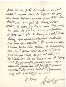 garni, avec manœuvres et un boy, pendant quatre mois : « Dans ces conditions on pourra travailler à son aise. […] Ils demandent ce qu’on aura besoin comme brosses, couleurs, et caetera. J’ai répondu que cela est vague, selon les décors, mais pour brosses, pots et couleurs on peut prendre comme base du départ ce que nous avons dépensé comme quantité dans Phèdre, car une fois les deux “cadres” établis, le reste du décor sera très proche de celui de Phèdre, comme profondeur exepté peut-être de deux (ou trois) décors. […] Ainsi nous aurons 15 jours pour chaque décor, ce qui est bien, vu les dimensions »…