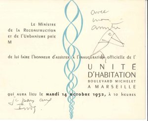 Édouard Jeanneret, dit LE CORBUSIER (1887-1965). Carton d’invitation imprimé avec dessin original à la plume et 7 mots autographes ; obl.ong in-12.- Carton d’invitation à l’inauguration officielle de l’Unité d’habitation de Marseille...