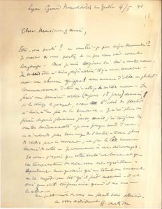 Henri MATISSE (1869-1954). L.A.S., Lyon 4 mai 1941, à Henry de Montherlant ; 1 page in-4 (un bord un peu froissé et réparé).- Il espère que Montherlant sera encore à Nice à son arrivée… « Je crains si vous partez de ne pas vous voir...