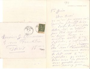lui répondre plus tôt, « les distributions postales, ici, n’étant pas très régulières. Ai bien reçu ce matin votre 2me dépêche, c’est entendu pour 7 h dimanche rue Franklin. […] Je serai bien aise de savoir vers quelle heure vous pensez que nous [serons] de retour à Paris ne tenant pas à passer deux nuits à Paris, et voulant me mettre au travail dès lundi matin. Serait-il possible que je puisse embrasser mon fils qui se trouve à peu de distance de Reims entre Fismes et Craonne, exactement à Ventelay, convoi automobile, section sanitaire 46. […] Quelle joie ce serait et pour lui et pour moi »…