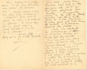 lui écrit « au milieu de cette atmosphère scientifique [le jeune Jouvet étudie alors la pharmacie] et artistique qu’est le Quartier Latin. Je viens d’aller voir jouer ce soir Les Bouffons chez Sarah Bernhardt. C’est assez peu intéressant d’autant plus que Sarah avec sa voix de vieille femme s’y obstine à jouer des rôles de prince charmant. Bref passons ; je n’ai pu aller à l’Odéon revoir jouer Chatterton, que j’avais déjà vu jouer jeudi dernier […]. Vous avez pu voir sur le journal que Mlle Bellanger qui remplissait un des principaux rôles celui de Kitty Bell a tenté de se suicider… Je sens de mieux en mieux que le métier d’acteur n’est qu’un métier et que dans toutes les situations où peut se trouver l’humaine nature ici-bas, dans toutes dis-je elle est malheureuse parce qu’il y a toujours une soif d’idéal qui n’est pas apaisée, un besoin infini et un désir profond d’amour qui ne sont pas assouvissables ici-bas »… Il lui suggère fortement la lecture de Chatterton, dans lequel elle trouvera « des pensées profondes et justes du superbe Vigny [qui] dépasse en psychologie et en vraie biologie tout ce que nos philosophes modernes ont pu entasser dans leurs fastidieux bouquins. Il faut vivre mon fils, se taire et prier Dieu, tel est le cri du Quaker à Chatterton, désespéré. Quelle sublime parole digne du plus grand philosophe »… C’est depuis qu’il a lu La Maison du Berger, qu’il sent ce qu’est la vie : « La vie est une épreuve. Ceci n’est plus un mot pour moi. Je le sens, j’en suis pénétré. Mais ce n’est pas un piège que Dieu nous a tendu. Il faut vivre, le suicide est lâche. Se taire, être stoïque et prier Dieu, les hommes sont si méchants !!! […] Je comprends maintenant qu’il faut vivre. Qu’il faut faire effort. Il faut être positif et faire dominer la volonté sur l’imagination. Dieu nous a créés pour faire effort et non pour nous laisser aller au gré d’une imagination folle. Nous devons agir nous ne devons pas rêver. C’est un vol que nous faisons à l’humanité et à Dieu. Les paroles me manquent pour exprimer toutes ces choses »… La pièce vaut « en vérité en profondeur et en moralité le plus beau poème chez Hugo et la plus belle chanson de Roland. […] L’imagination est bien la plus belle des facultés humaines et la plus pernicieuse en ce sens que si on la laisse dominer, elle conduit à la déchéance morale la plus profonde »… Il délaisse à regret cette bouffée de métaphysique pour endosser à la hâte la robe d’ignorance d’Hippocrate et lui donner un remède pour guérir les crevasses. Puis, revenant à la philosophie, il promet à Aline de lui parler de quelques-unes de ses grandes idées « qui s’objectivent de plus en plus et qui germent depuis longtemps déjà chez moi. Vous en avez déjà quelque aperçu avec ma dualité de Don Quichotte et Don Sancho ». Il conclue amèrement : « Vigny était un grand poète et un grand philosophe et je ne suis qu’un pharmacien »…- On joint une autre enveloppe à la même (mars 1907), et une carte postale a.s. à Louis Mazzi (1er avril 1911).