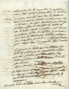 (1790).- Il acquiesce avec plaisir aux arrangements proposés ; il sera à Toulouse un mois avant les États, « l’établissement sera bien avancé et nous verrons d’en approprier l’intérieur d’une manière convenable. Je vous porterai un état très circonstancié de ce quil nous faut tant en instruments qu’en morceaux d’histoire naturelle, nous pourrions même donner à cette époque les principes chimiques c’est laffaire de 15 à 20 leçons et […] presque toutes les expériences qui y sont relatives se font sans feu ce qui arrange n’ayant encore aucun local approprié pour en faire, la salle de physique sera suffisante »… Il prendra Reboul en passant à Pézenas, et augure bien de la suite ; il lui fera lire le cours de chimie qu’il rédige en ce moment. « Je poursuis toujours les objets de ma fabrique et vais avoir terminé mon établissement d’alun, je partirai dans 15 jours pour aller former l’établissement en verre à Vitré de Mr Rey »… Il parle des deux nouvelles verreries en Champagne et en Bourgogne, dont les matières premières sont le feldspath et la lave ; à Vitré, on a composé avec du sable blanc, du feldspath et de la craie… « Dites à Reboul que le concours de la lumière et de l’air fait végéter les sels comme les plantes surtout les métalliques et les autres qui sont avec excès d’acide. Il suffit pour faire les experiences de saturer l’eau d’un sel à la température de l’atmosphère, de couvrir bien exactement la moitié du vase en dessus et en dessous avec du taffetas noir et d’exposer à une lumière reflechie la partie de la liqueur qui est à nud, les experiences sont delicates mais le succès est constant et je suis vers la fin après les avoir repetées variées et repondu à toutes les objections. Dites au même que Kirwan en m’annonçant que la Societé royale de Londres alloit me nommer associé étranger m’a promis un ouvrage contre la doctrine de Lavoisier, les ppales raisons qu’il me donne en faveur de ses opinions me paroissent indignes d’un aussi grand homme et je viens de lui envoyer une longue épitre en réfutation. J’ignore de quelle manière il le prendra, il m’a écrit que Mr de Morveau etoit chancelant et quil craignoit que son voyage à Paris n’en fît un apôtre de Lavoisier »… Chaptal approuve le raisonnement de son ami sur le gaz hépatique, et cite d’autres travaux sur l’acide fluorique, puis termine en évoquant le cardinal Loménie de Brienne, récemment promu principal ministre d’État : « Les opérations de l’archevêque de Toulouse sont toutes très gouttées par nos compatriotes politiques. Pour moi, je désire qu’il vive et que le roy conserve sa bonne volonté, nous en serons tous plus heureux »…
