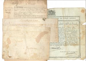 IV, de dons faits au prieuré de Notre-Dame de Beaumont en 1244 (1656). Constitution de rente (Paris 1698). Copie des testaments d’Athanase Tipaldÿ et de Jean Thierry faits à Corfou 1636-1654 (Paris 1746). Inventaires à la requête d’un piqueur à la petite écurie du Roi à Versailles et du premier garçon du château de Versailles (1762, 1772). Certificat de congé pour un soldat provincial, signé par Daniel-Victor de Trimond (Montauban 1786). Titre de propriété (Montargis 1787). Extrait des Armoiries de France d’Hozier, actes de cautionnement pour les droits des fermes générales unies, mémoire pour l’élargissement d’une route royale, état des Capétiens jusqu’à Louis XII, divers documents notariés…