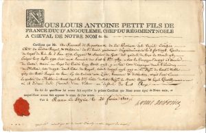 en-tête Nous Louis Antoine petit fils de France duc d’Angoulême, chef du Régiment noble à cheval de notre nom, cachet de cire rouge aux armes (un bord un peu effrangé).- Certificat de service pour un chevalier de Saint-Louis, M. de Fournel de Rouvaux : gendarme de gendarmerie, 1778, Garde du corps du Roi, 1779, écuyer et fourrier du guet des gardes du corps, 1787, émigré, 17 septembre 1790… « Etoit aux Journées des 5 et 6 8bre 1789. A fait la Campagne de 1792 à l’Armée du Centre, arrivé au Corps de Condé le 19 avril 1793 », a servi jusqu’à ce jour « avec zèle, honneur et distinction », et dans le Régiment noble à cheval Angoulême « en brave, digne & loyal gentilhomme »…