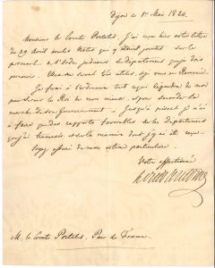 et sur la conduite de quelques individus »… Dijon 1er mai 1820, au comte Portalis, le remerciant pour ses notes « sur le personnel de l’Ordre judiciaire du Département que je dois parcourir. Elles me seront très utiles ». Il fera tout son possible pour « servira le Roi de mon mieux, et pour seconder la marche de son Gouvernement. Jusqu’à présent je n’ai à faire que des rapports favorables sur les Départements que j’ai traversés et sur la manière dont j’ai été reçu »…