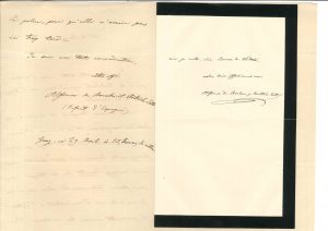 pages et demie (deuil) et 2 pages in-8.- 26 décembre 1887. Tout est en ordre à Trieste pour le transport des corps de son père et de sa grand-mère. « S.M. l’Empereur (que j’ai eu le bonheur de voir personnellement et qui a eu la grande bonté de donner toutes les permissions pour l’enterrement dans la Cathédrale) a écri Lui-même à ma mère […] et les deux caisses conduites par le chef des pompes funèbres de Brighton partiront d’Angleterre les premiers jours de l’an »… 29 avril. Ils n’iront pas à la cathédrale aujourd’hui, à la demande de l’évêque. « Nous sommes tranquils et décidés à nous défendre énergiquement si on nous attaque, mais je demande en même temps que vous fassiez votre devoir, et pour première chose vous envoyez de suite de la troupe ici, pour faire débarasser la place vis-à-vis de ma villa, car d’un instant à l’autre il pourrait arriver des malheurs. Je vous prie de vouloir prévenir donc de suite la police, pour qu’elle n’arrive pas ici trop tard »… Il signe « Alfonso de Borbon y Austria-Este (Infant d’Espagne) ».