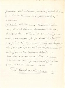 en-tête Hotel Cayré.- Paris 21 octobre 1935, à l’architecte Marcel Génermont. Évocation de fouilles, et souhait d’assister à la séance annuelle de la Société d’émulation du Bourbonnais… Château du Bost, par Besson (Allier) avril-mai 1943, à un comte. Son voyage à Paris est retardé. « Entre temps j’ai fait une démarche pour voir le chef ; mais je ne sais pas encore quand je le verrai. Je crois que l’urgence n’est pas très grande d’après mes renseignements, il y a un ralentissement certain, après le discours dont nous avons déploré tous les deux l’imprudence. En affaires, comme dans la vie, la discrétion est un élément essentiel »… – « J’ai pu voir la personnalité dont je vous avais écrit, et, cela n’a été qu’une reprise de contact utile »…