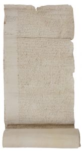 BRETAGNE. Charte, 7 août 1522 ; 4 vélins cousus en rouleau (196 x 34 cm) ; en français (2 trous affectant le texte, légère trace de moisissure en marge).- Contestation et transaction après arbitrage entre le recteur de Vezin et les moines de...