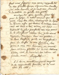 in-4 (taches).- Émouvante lettre d’adieux à sa femme avant d’être guillotiné. « Les destinées de chaque mortel sont arrêtées chere et douce amie, lorsque l’innocence opprimée ne peut se faire entendre. Le seul azile qui lui reste est dans le sein de l’éternel, il m’eut eté bien doux après avoir fidelement servi ma patrie de passer des jours sereins a tes côtés […] mais enfin puisque je n’ai pu parvenir a prouver aux hommes ma loyauté, sois convaincue chere épouse de l’innocence de l’homme qui aurait désiré ne vivre que pour toi et son pays […] j’ai vecu honnête, et je rends avec sérenité à la nature ce qu’elle m’a prêté »… On joint une P.S. (déchirée avec manques) du colonel Blondel, directeur du Dépôt de la Guerre, certifiant la condamnation et l’exécution de Chopplet (1852).