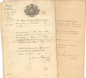 Roi à un emploi de sous-lieutenant à la suite dans le régiment des chasseurs de l’Allier (1824). Congé donné au lieutenant aux chasseurs de Nemours (1830). Nomination du lieutenant en non-activité, à un emploi de son grade dans le 10e régiment de chasseurs, puis au 4e (1831), puis à un emploi de capitaine dans le même régiment (1832). Promotion au grade de chef d’escadrons dans le 2e régiment de hussards (1844), de lieutenant-colonel du 6e de chasseurs (1847), de colonel du 3e régiment de chasseurs (1851). Promotion au grade d’officier de la Légion d’honneur (1854), puis à celui de commandeur (1859). Certificat d’obtention de la médaille commémorative de la Campagne d’Italie (1859). Nomination au grade de commandeur de l’Ordre militaire de Savoie (1860). Brevet de membre de l’Ordre de l’Aigle rouge, 2e classe avec l’étoile (1861). Nomination de grand officier de la Légion d’honneur (1868). Nomination au commandement de la division de cavalerie du 1er corps d’armée (1868). Les documents sont signés par le baron de Damas, le comte de Piré, le comte Gentil Saint-Alphonse, le duc de Dalmatie, le lieutenant général Préval, le général Trézel, le comte Randon, le maréchal Vaillant, Guillaume Ier, le comte de Flahault, le maréchal Niel, etc.- On joint 3 L.S. ou P.S. à son oncle maternel, Charles-Yves-César-Cyr du Coëtlosquet, signées par le maréchal Gouvion Saint-Cyr, le marquis de Clermont-Tonnerre et le maréchal MacDonald (1815-1826).