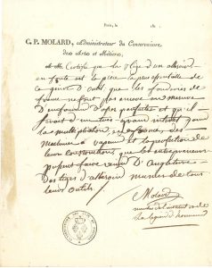 Divers. 5 lettres ou pièces.- Claude Pierre Molard (P.A.S. à son en-tête comme Administrateur du Conservatoire des Arts et Métiers, au sujet d’outils et de fonderies). Balthasar-Anthelme Richerand (P.A.S. comme professeur de l’École de...