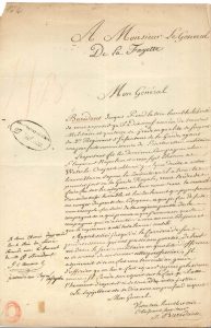 Buridant, « dix-neuf années de services militaire et quatorze de grade en qualité de sergent du 3e Regiment d’Infanterie de la Garde », vétéran des dernières campagnes de l’Empereur, blessé à Waterloo, aspire au grade d’officier et fait valoir qu’il s’opposa à l’ordre donné à la Garde royale de faire feu sur les citoyens… Ternaux appuie sa demande, et Lafayette ajoute : « Je m’unis à mon collègue »…- On joint une L.S. du Directeur Merlin de Douai, 29 brumaire VI (12 novembre 1797).