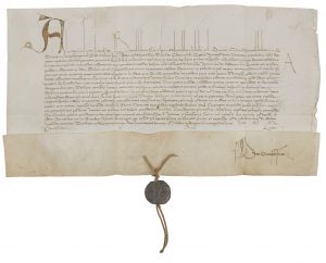 Roderigo Borgia, Alexandre VI (1431-1503) Pape en 1492. Bulle manuscrite en son nom, Rome à Saint-Pierre 3e des calendes de mai (29 juin) 1497, 5e année de son pontificat ; vélin in-plano (24,5 x 46,5 cm), lettrine, sceau en plomb Alexander Papa...