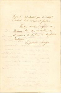 réception d’un recueil de poèmes de Banville [probablement Eudore Cléaz, 1870, dont la dédicace lui est adressée ; JLD estimait qu’il pouvait s’agir des Occidentales]. « Que c’est aimable à vous d’avoir pensé à me faire ce précieux envoi ! Oui, sans doute, je désirais vivement lire vos dernières poésies, mais pouvais-je penser qu’elles m’arriveraient sous cette forme délicieuse ! […]. Mais la pièce de vers que vous m’adressez au commencement, comment ne pas vous en remercier de suite du plus profond de mon cœur ? Recevez donc, avec ses remerciements, les plus chères pensées qui restent à ce pauvre cœur brisé, privé de l’affection qui le remplissait tout entier, et qui voulant se répandre sur ceux qui ont aimé et qui glorifiait l’objet de cette immense affection perdue ».