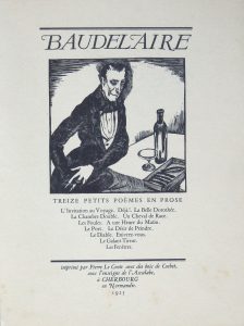 BAUDELAIRE (Charles). Treize Petits Poèmes en Prose. Imprimé par Pierre Le Conte avec des bois de Cochet. Cherbourg, L’Ascalabe, 1925. In-4, broché par un cordon tressé.