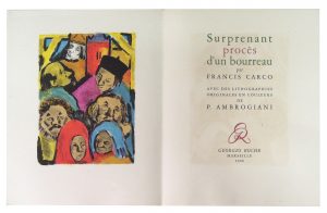 CARCO (Francis). Surprenant Procès d’un Bourreau. Avec des lithographies originales en couleurs de P. Ambrogiani. Marseille, Georges Roche, 1948. In-folio, sous chemise et étui papier vert (un peu frotté). Rares rousseurs. Ouvrage tiré à...
