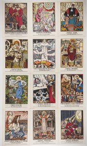 Planches aux couleurs vives, en bel état, inspirées de l’imagerie populaire : St Vincent, St Fiacre, St Nicolas, St Honoré, Ste Catherine…