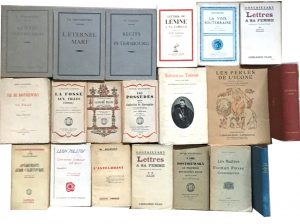LITTÉRATURE RUSSE. Réunion d’ouvrages (env. 30 vol.) fin XIXe et XXe s. dont : • HALPÉRINE-KAMINSKY. Tolstoï par Tolstoï. 1912. Grand in-8, broché. Envoi de Halpérine. • MÉREJKOWSKY. L’Âme de Dostoiewsky. Bossard, 1922. In-12,...
